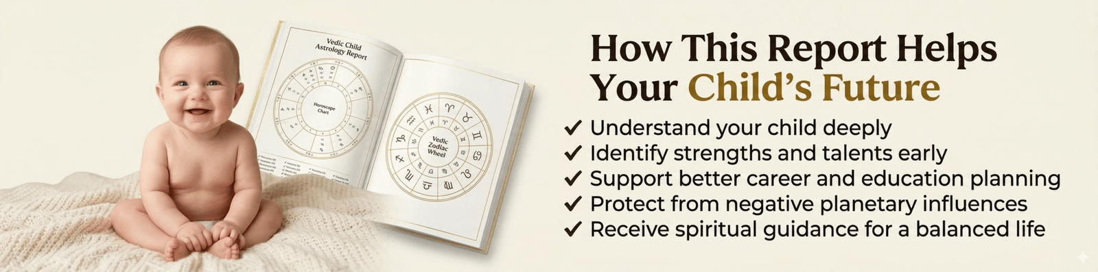 The report provides astrological insights about personality, talents, education potential, and planetary influences, helping parents guide their child in the right direction.